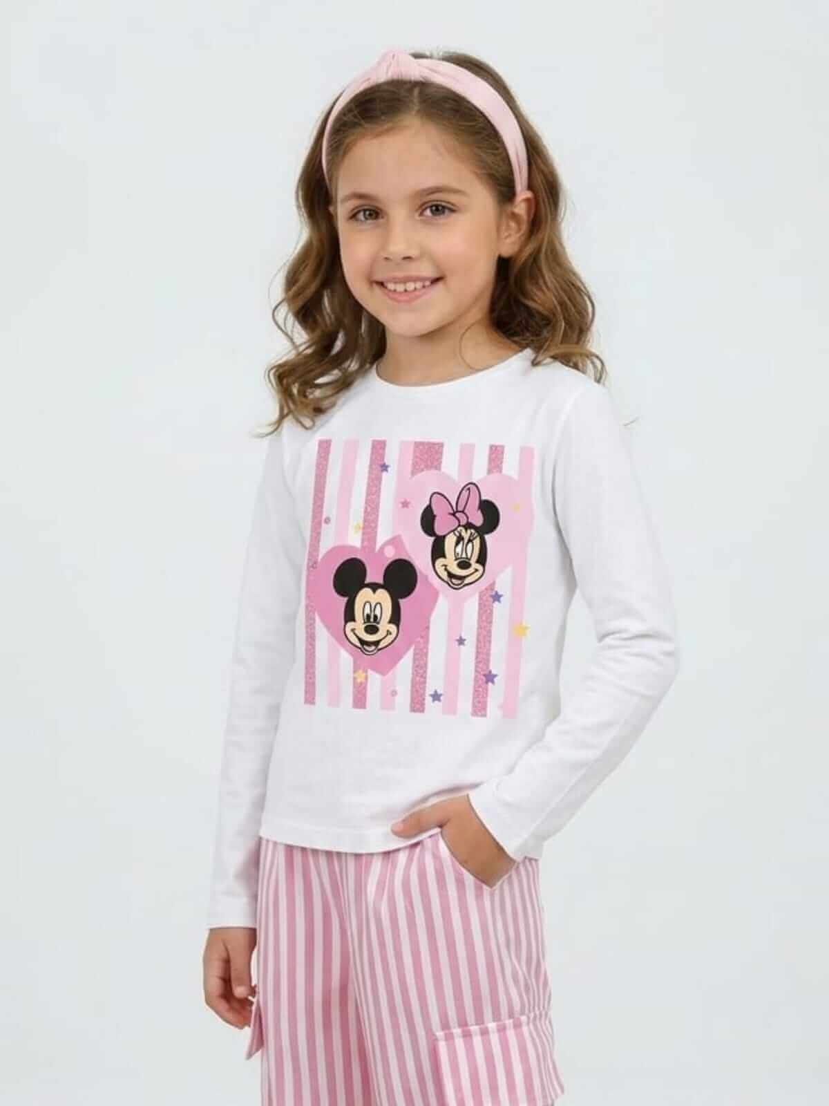 O modelo possui estampa frontal da Minnie com listras e corações,