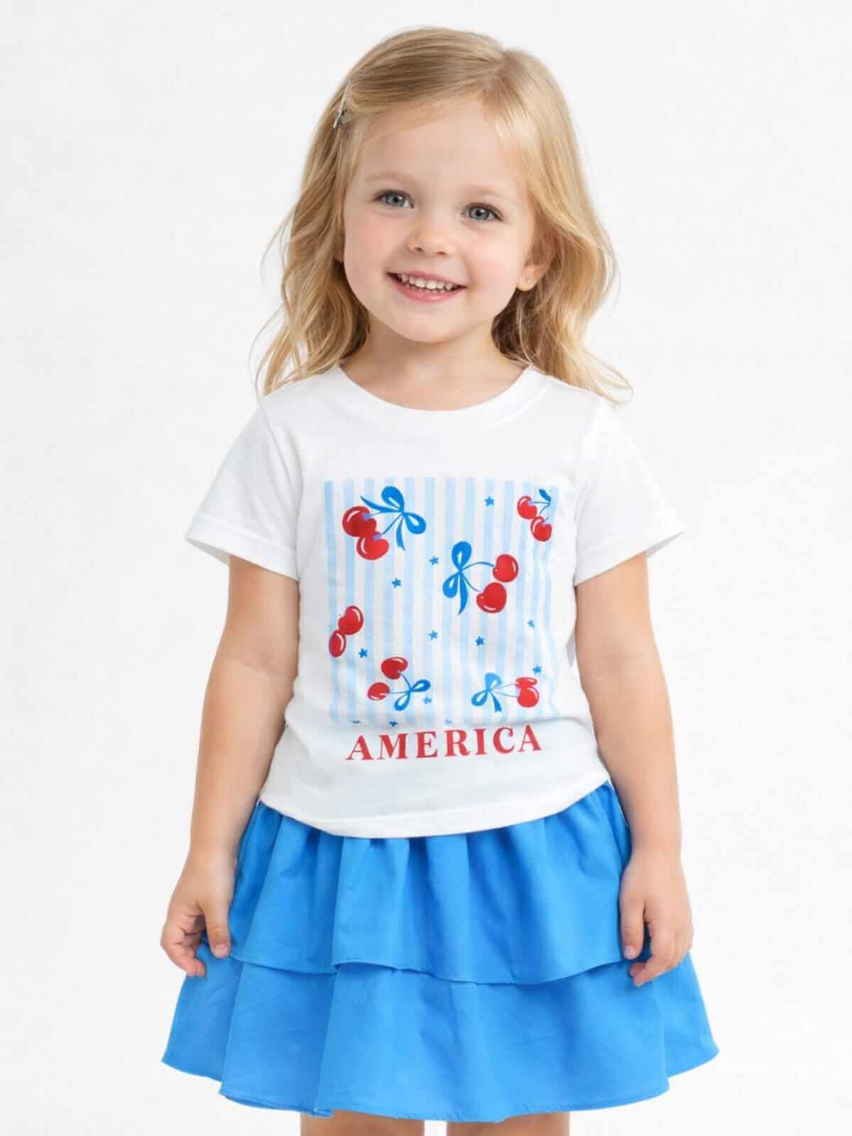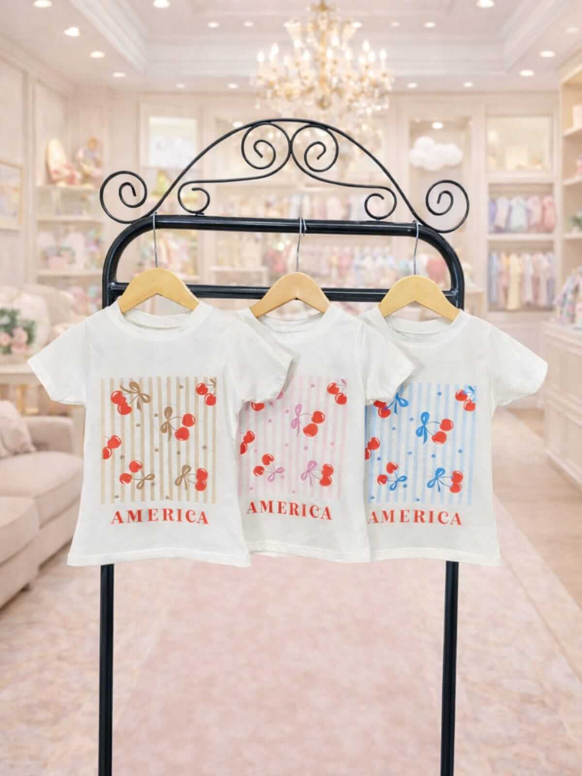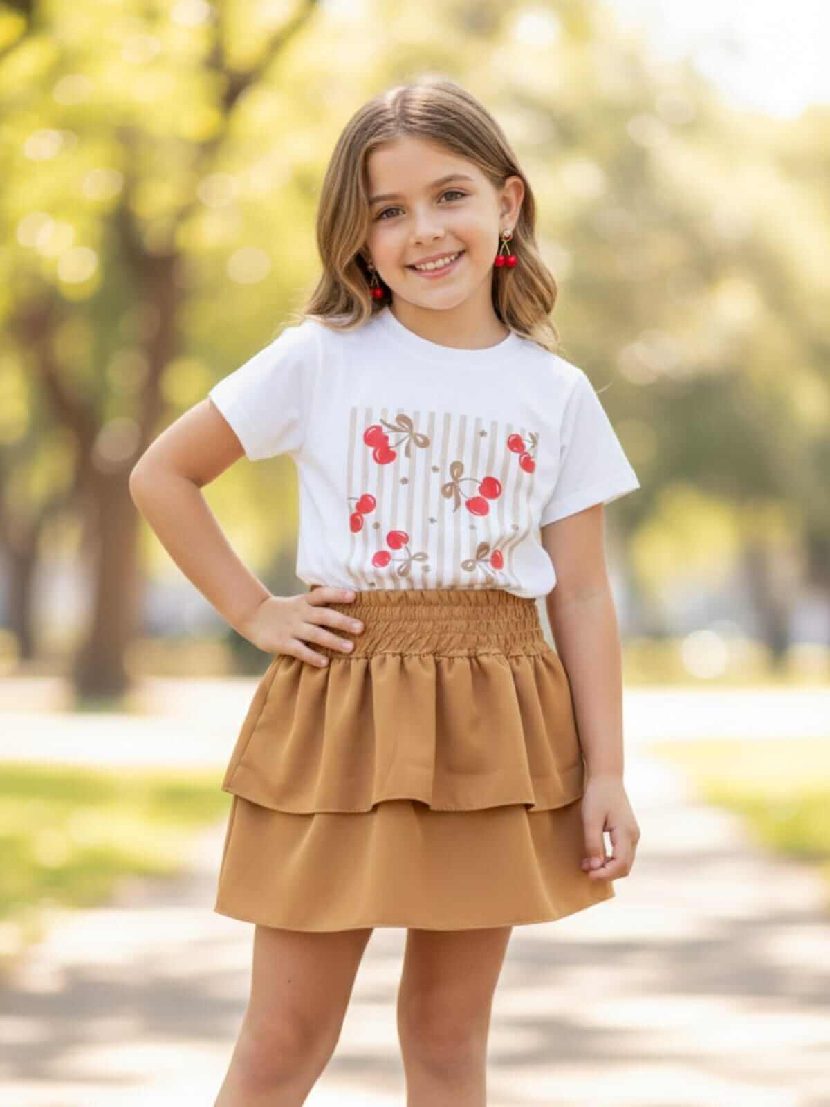Possui estampa exclusiva com cerejas e laços, combinando cores suaves e modernas que seguem as tendências da moda infantil.